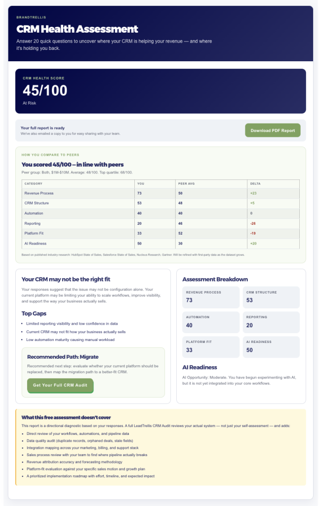 Scores all four CRM dimensions from your self-reported answers: Revenue Process · CRM Structure · AI & Automation · Reporting & Fit